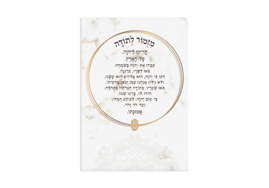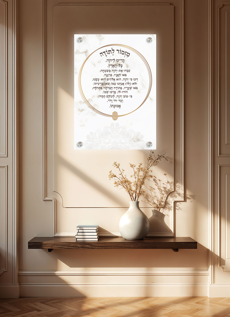 מזמור לתודה מזכוכית מחוסמת בגדלים שונים. עובי הזכוכית: 6 מ"מ. התמונה מגיעה כולל חורים וספייסרים להתקנה. אם אתם מעוניינים להוסיף קדושה לביתכם בדרך יפה ומרגשת – הזמינו מזמור לתודה מזכוכית מחוסמת בגודל לבחירתכם.התמונה מודפסת בטכנולוגיית הדפסה ישירה על גבי החומר באיכות גבוהה במיוחד. התמונה באתר להמחשה בלבד – הגרפיקה תותאם באופן פורפורציונאלי למידה שתבחרו.