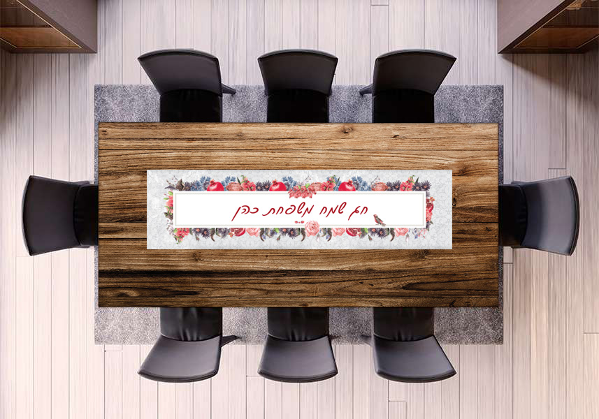 ראנר במידה וטקסט בהתאמה אישית דגם ציפור ופרחים. אקססוריז מושלם לעיצוב שולחן החג. מהווה מתנה מהממת לאהובים שלכם. עיצוב חגיגי עם אלמנטים של פרחים, ציפור ורימונים, עיצוב אופטימי, מלא בתקווה, שתבוא עלינו שנה טובה ובשורות טובות. הראנר עשוי לינולאום איכותי בעובי כ-2 מ"מ, רב פעמי, נקיון קל באמצעות סמרטוט לח  בלבד, הדפסה ישירה איכותית ועמידה על החומר. בחרו מידה מתוך סרגל המידות  (אם לא מצאתם מידה מתאימה צרו קשר בוואט'צאפ). כתבו את הטקסט בהערות מטה – עד 4 מילים אופציות להשראה: "שתבוא עלינו שנה טובה", "חג שמח ושנה טובה", "שנה של התחלות חדשות", "חג שמח משפחת כהן"