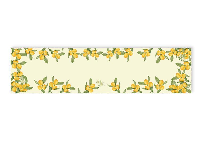 ראנר דגם לימונים הוא האקססוריז המושלם לעיצוב שולחן החג וליום יום ומהווה מתנה מהממת לאהובים שלכם. עיצוב חגיגי המתאים במיוחד לחג סוכות. הראנר עשוי לינולאום איכותי בעובי כ-2 מ"מ, רב פעמי, נקיון קל באמצעות סמרטוט לח בלבד, הדפסה ישירה איכותית ועמידה על החומר. בחרו מידה מתוך סרגל המידות  (אם לא מצאתם מידה מתאימה צרו קשר בוואט'צאפ). אם ברצונכם להזמין את אותו העיצוב כולל טקסט בהתאמה אישית לחצו כאן