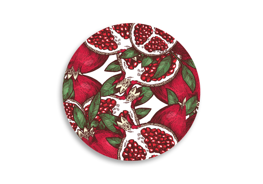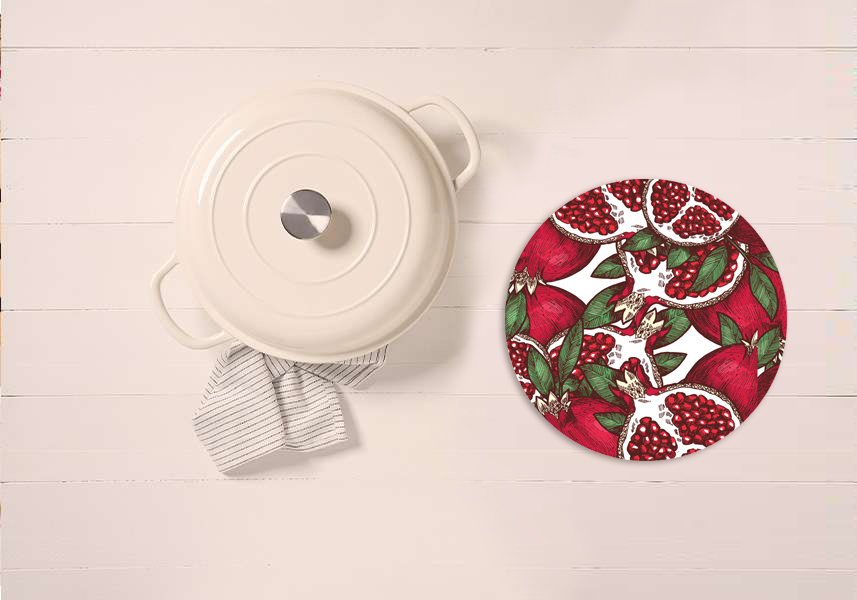 תחתית לסיר עגולה מעץ דגם רימונים בעיצוב חגיגי שממלא את שולחן החג בהמון צבעוניות ושמחה.התחתית מיוצרת בטכנולוגיית הדפסה ישירה על גבי העץ – עמידות ואיכות גבוהה במיוחד. גודל: כ-20 ס"מ.התחתית מהווה אקססוריז מושלם לשולחן החג ומתנה מושלמת לאהובים שלכם.